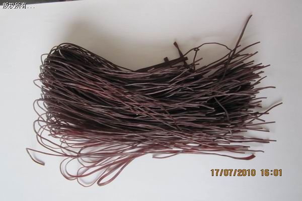 紫薯粉條傳統的手工工藝流程:選料提粉→配料打芡→加礬和面→沸水漏條→冷浴晾條→打捆包裝。紫薯粉條可以涼拌,將紫薯粉條先在沸水中煮7分鐘后,撈出再用冷水浸涼,根據個人口味,適當加入不同的配料和調料,拌勻即可。