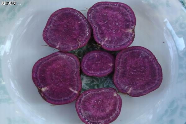 凌紫:加工及鮮食兼用型品種,葉色深綠,頂三葉紫紅,葉心臟形,前裂單缺刻,葉柄葉脈全綠色,蔓長1.5米左右,薯形長紡錘形,薯皮光滑,紫黑光亮,薯肉深紫色。薯塊斷開后流出紫色漿液,熟后黑紫色,香甜面沙,食味極佳,富含物質硒、碘、等元素,花青素含量高且穩,適合加工色素、全粉等,… |